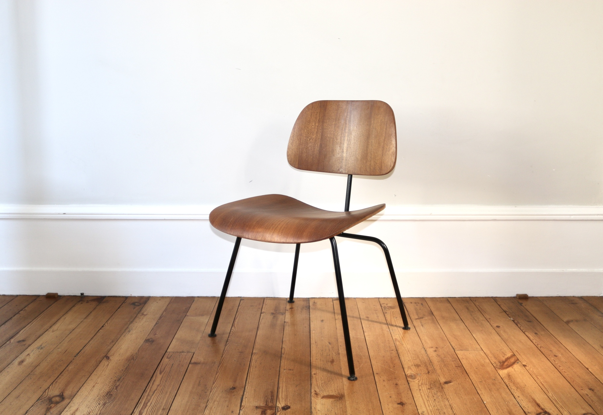Chaise Eames DCM vintage, 1960 Chaises Charles & Ray Eames DCM vintagele pied a été thermolaqué en noir vernis refait par un ébéniste,à noter une trace d'usure sur l'assise et une trace sur le dos du dossierdimensions : hauteur 77 cm x largeur 49 cm x profondeur 50 cm x hauteur d'assise 44 cm450 €