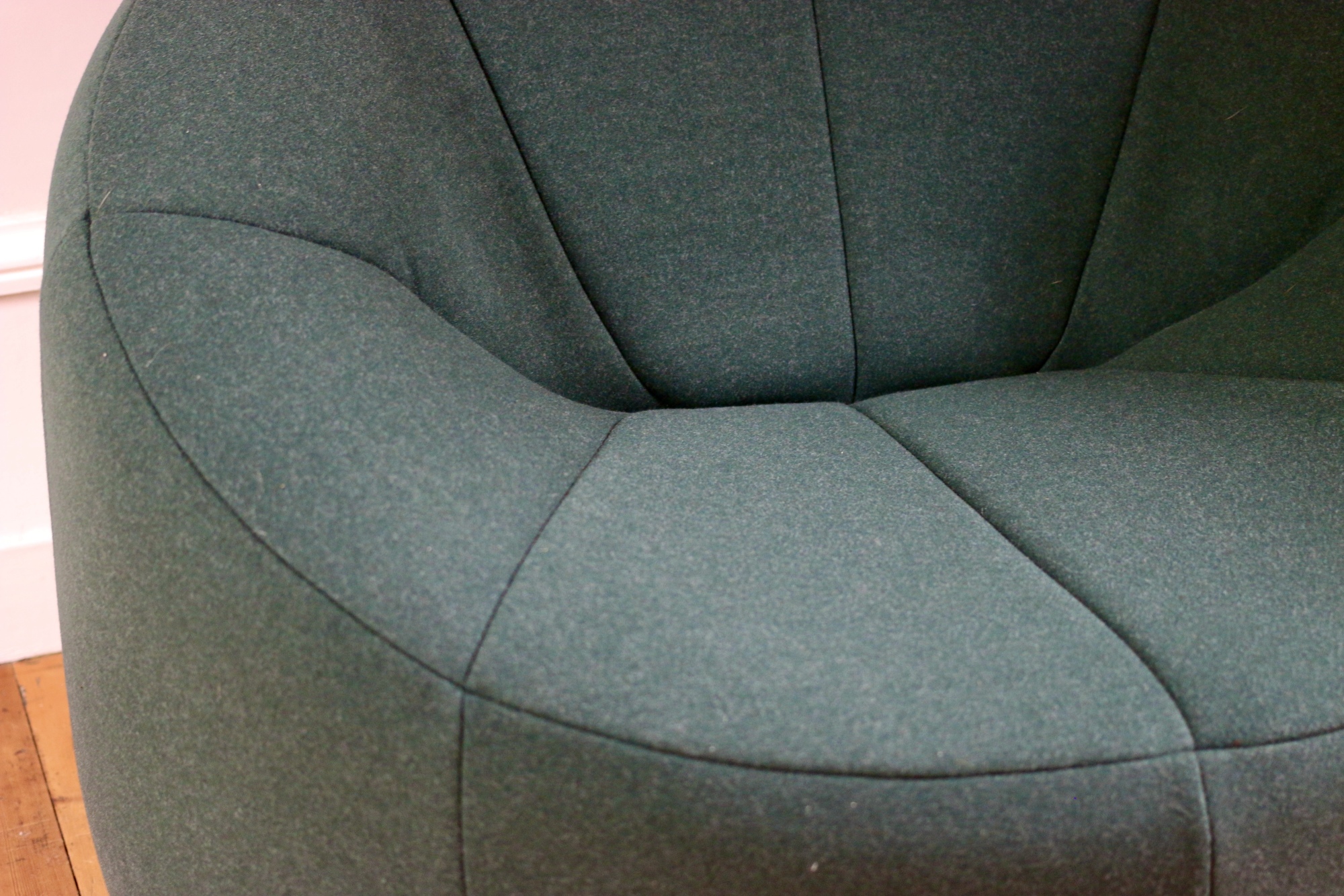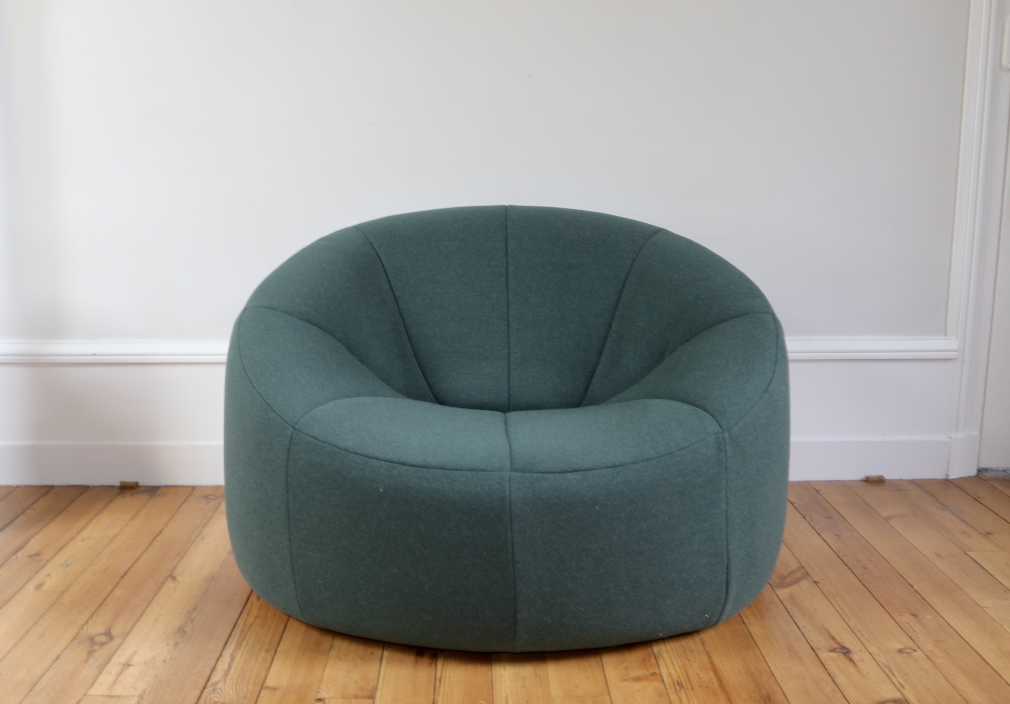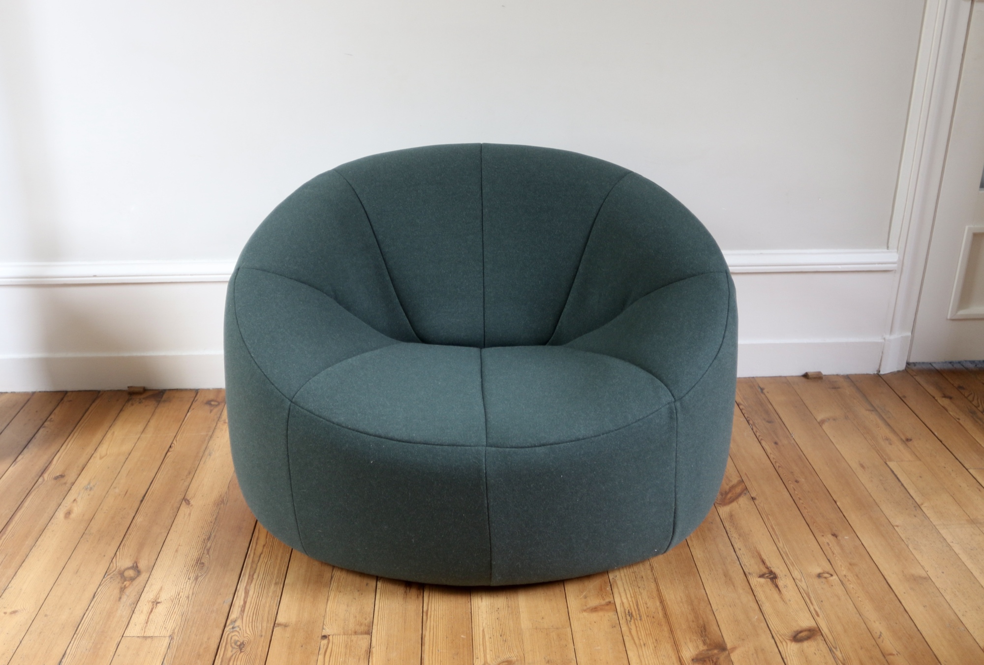 Fauteuil Pumpkin Pierre Paulin Ligne Roset Fauteuil Pumpkin signé Pierre Paulin, édition Ligne Rosetun must-have du design au confort incomparable qui meublait les salons de l'Elyséecouleur KakiFauteuil retapissé par un tapissier en tissu kaki, touché très douxDimensions : largeur 100 cm x profondeur 80 cm x hauteur 70 cm x hauteur d'assise 35 cm1600 €