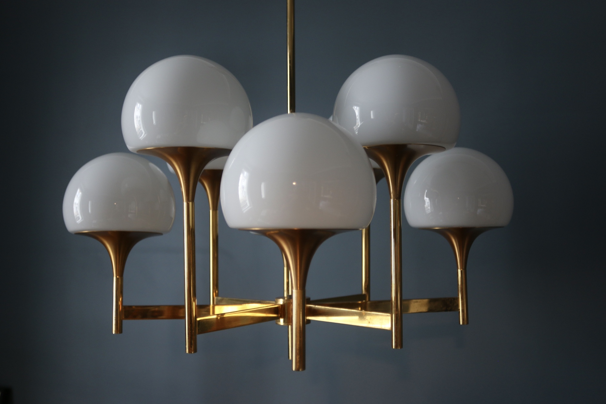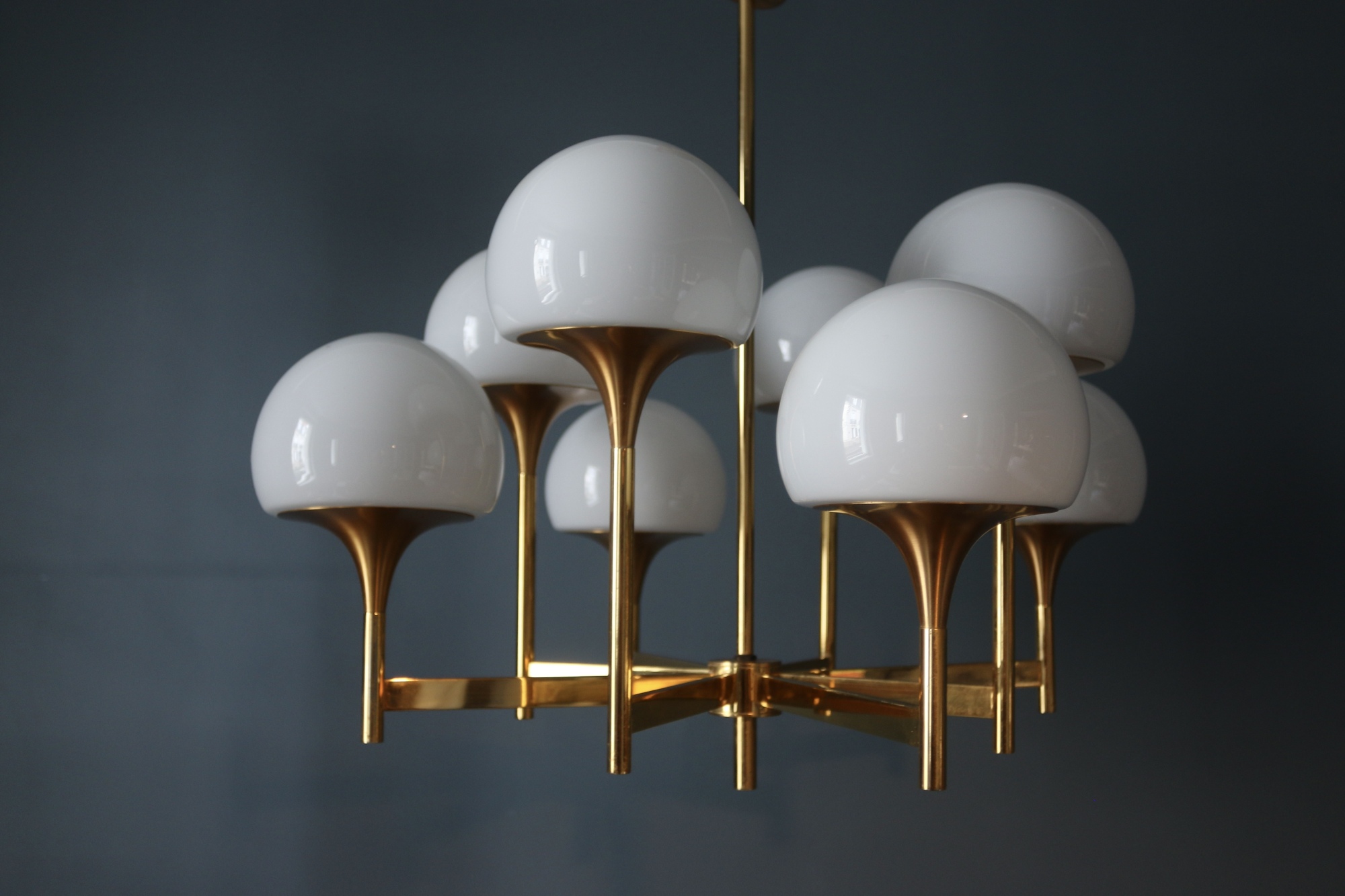 Suspension design vintage Gaetano Sciolari 1970 Rare suspension 8 feux or Gaetano Sciolari des années 70en très bon état, seul à noter quelques légères traces sur la dorure vendu à l'époque chez Roche BoboisDimensions : hauteur 70 cm (hauteur de la tige) x largeur 50 cm x longueur 50 cm1000 €